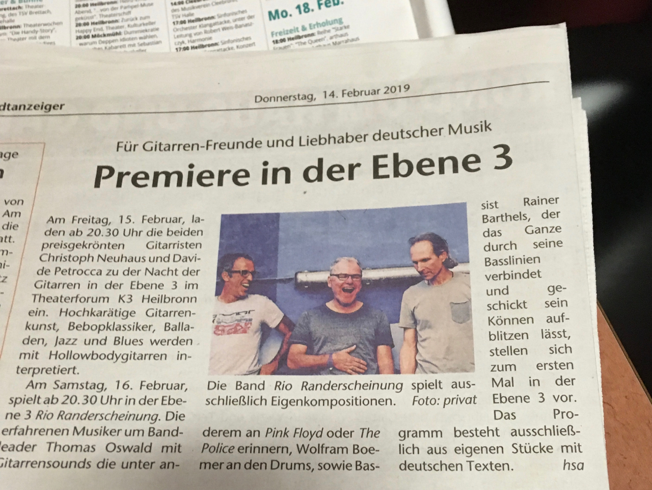 Ein Paradox? Ach, wo. Nach einem Wohnzimmerkonzert wollten sie endlich mit ihrem eigenen Ding an die Öffentlichkeit gehen: der Esslinger Gitarrist Thomas Oswald, der in Flein aufgewachsen ist und immer noch einen Koffer in Heilbronn hat, der Bassist Rainer Barthels und ihr Schlagzeuger Wolfram Boemer.